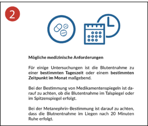Die Blutabnahme sollte liegend nach einer 20 minütigen Ruhephase durchgeführt werden. Bitte nehmen Sie mindestens an dem Tag der Blutentnahme und dem Tag zuvor keine Nüsse, Südbzw. Zitrusfrüchte sowie kakao-, kaffee- und vanillehaltige Produkte ein. Bitte rauchen Sie am Tag der Blutentnahme nicht. Bitte versuchen Sie, auch leichteren physischen Stress (z. B. kürzere Fahrradfahrten) vor der Blutabnahme zu vermeiden.